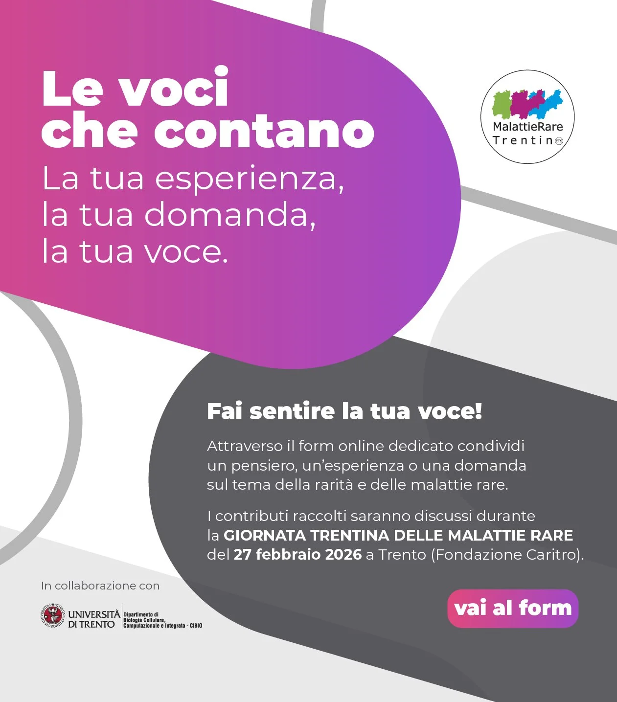 Le Voci che Contano è un’iniziativa promossa dall’Associazione Malattie Rare Trentino in collaborazione con CIBIO, che anticipa la XII Giornata Trentina delle Malattie Rare e favorisce il coinvolgimento attivo della cittadinanza nel dialogo con il mondo della ricerca.