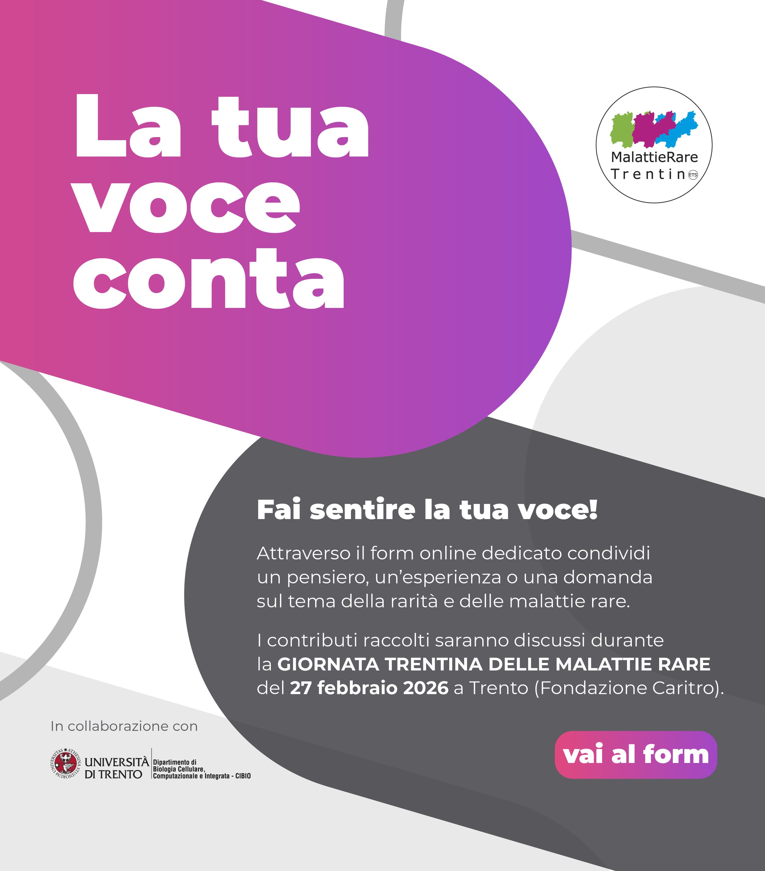 La tua voce conta è un’iniziativa nata in occasione della XII Giornata Trentina delle Malattie Rare (febbraio 2026) con l’obiettivo di promuovere il coinvolgimento attivo della cittadinanza nel dialogo con il mondo della ricerca.
